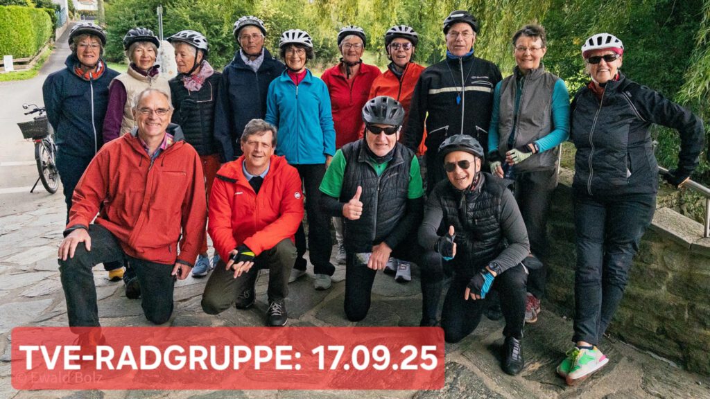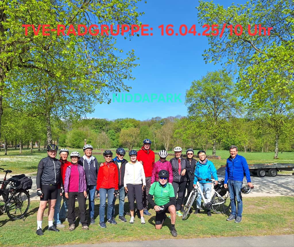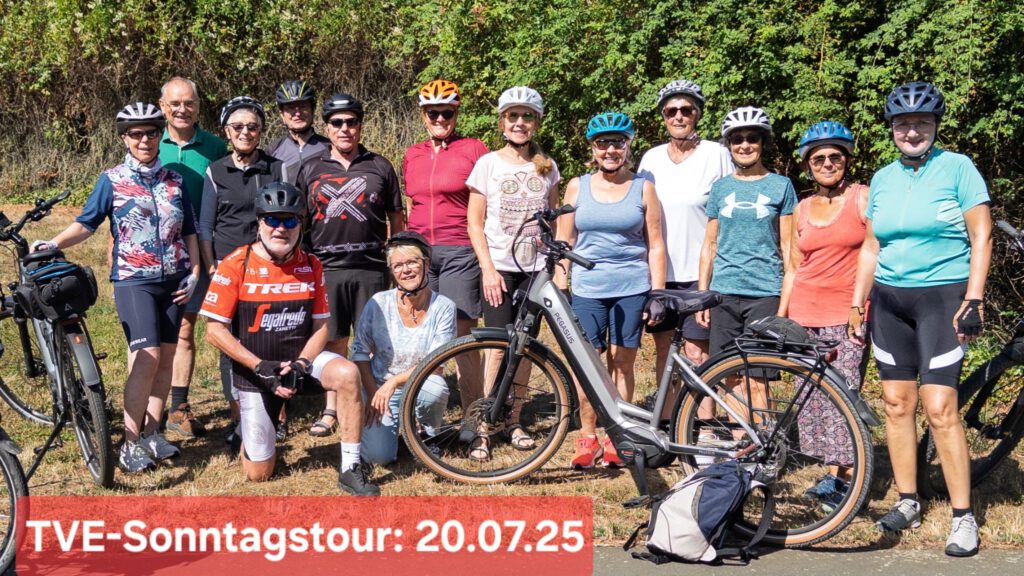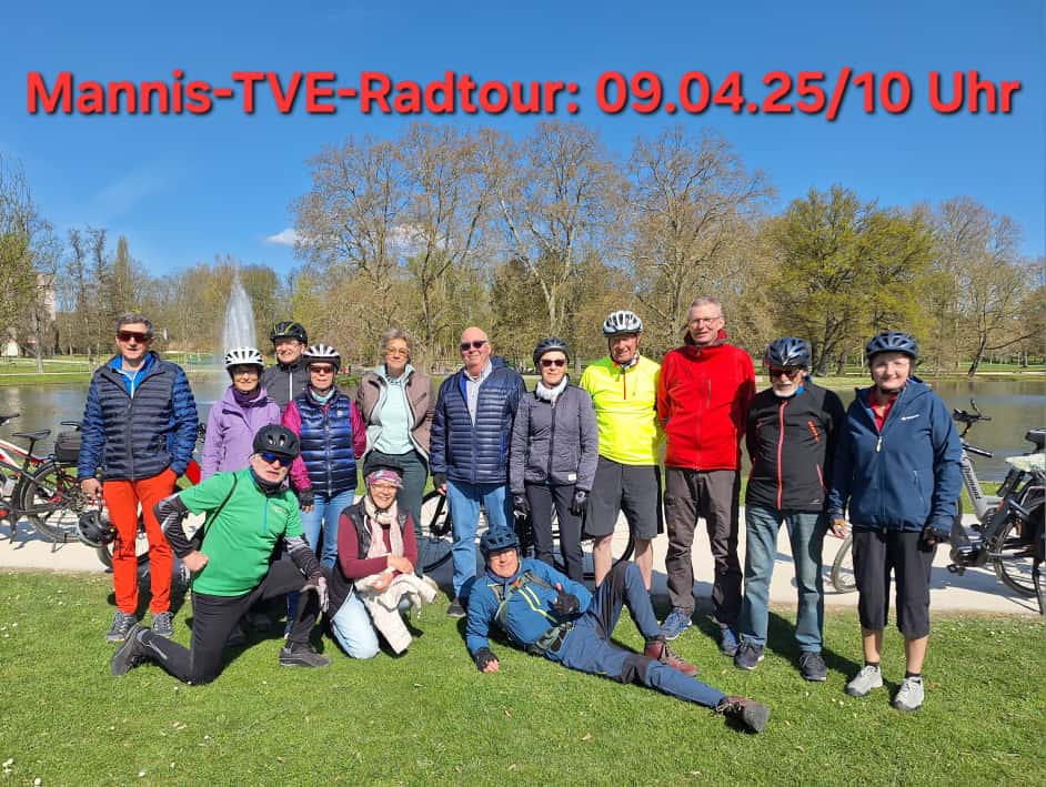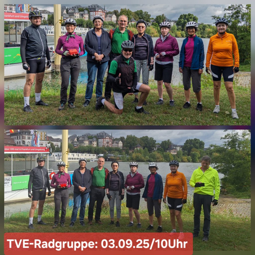 RADFAHREN …macht munter und macht Spaß. …hält fit. …bringt einen an Orte, wo man sonst nie hinkäme. …verursacht keine Parkprobleme und keine schlechte Luft. Radfahrer sind nett und sympathisch und bei jedem Wetter fest im Sattel. Allzeit gute Fahrt mit dem Turnverein Eschborn! Geführte Radtouren April bis September. Die Radtouren finden alle zwei Wochen mittwochs statt und zwar morgens um 10:00 Uhr und abends um 18:00 Uhr. Die Streckenlänge beträgt 20-30 km und dauert 90-120 Minuten. Tagestouren am Sonntag über 50-70 km von 10:00 bis 16:00 Uhr. Treffpunkt am Eschenplatz/Museum |